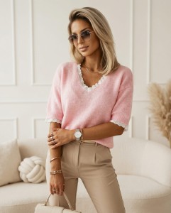 Sweter o luźnym kroju z delikatnej dzianiny, ozdobiony koronką przy dekolcie i rękawach. Miękkość materiału gwarantuje wygodę na co dzień, a pastelowe kolory wprowadzają świeżość do garderoby.